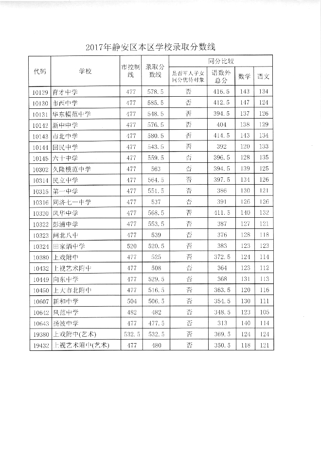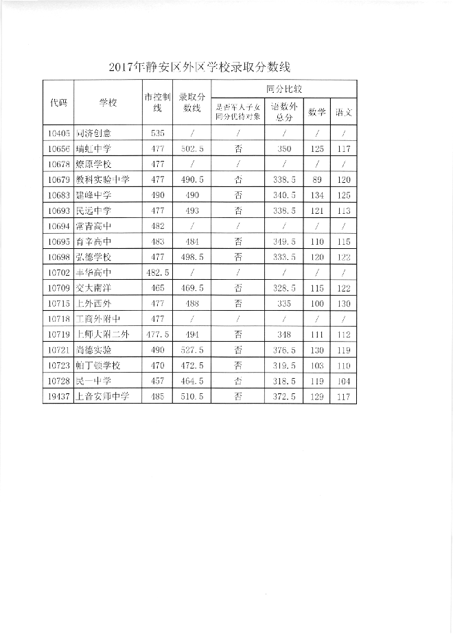 2017年静安区高中录取分数线