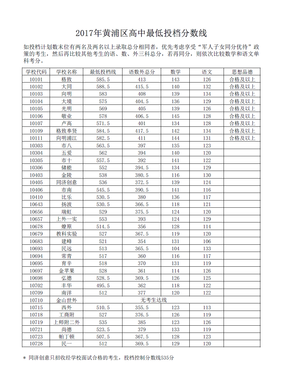 2017年上海市民办高中最低投档..