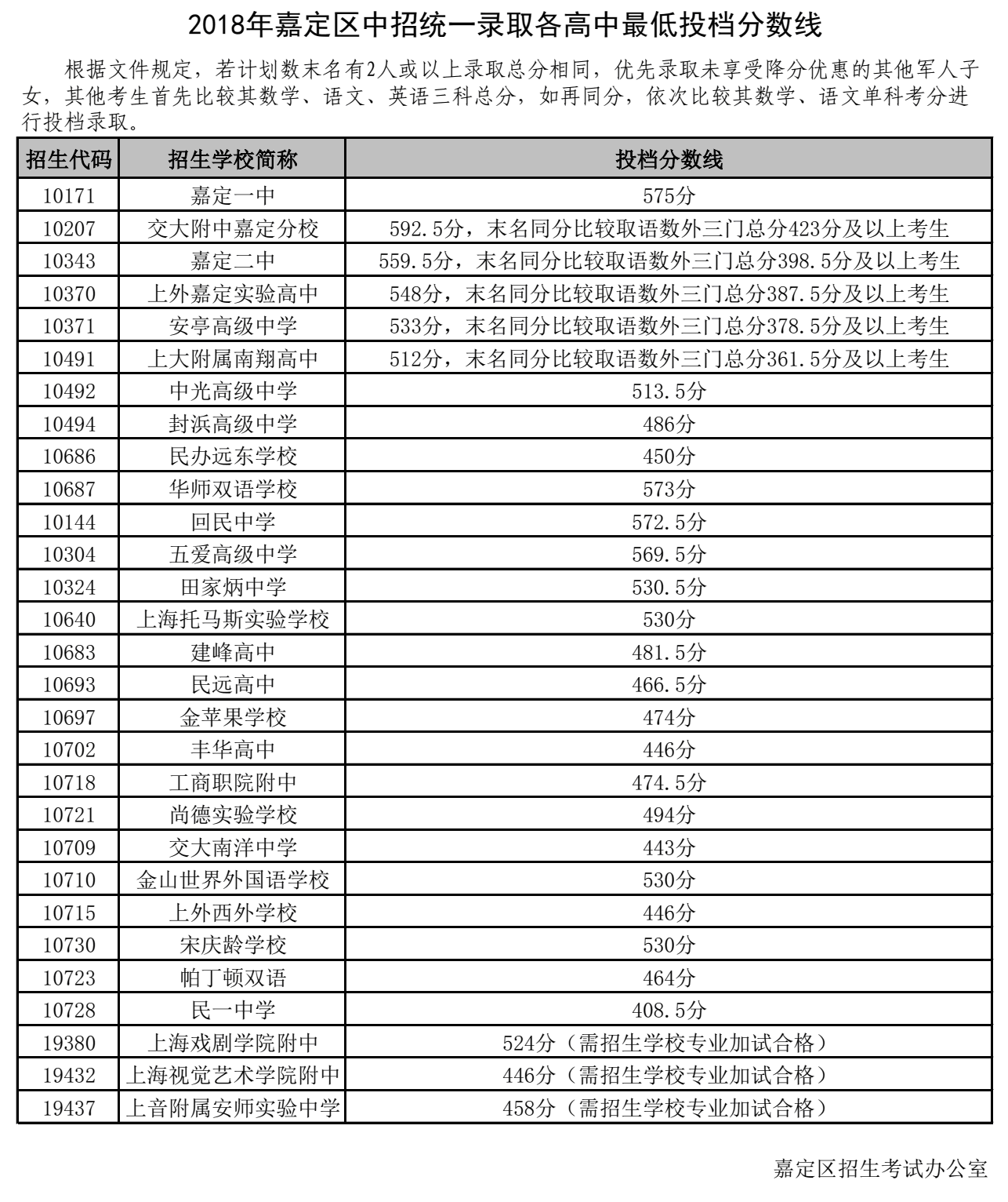 2018年嘉定区高中录取分数线